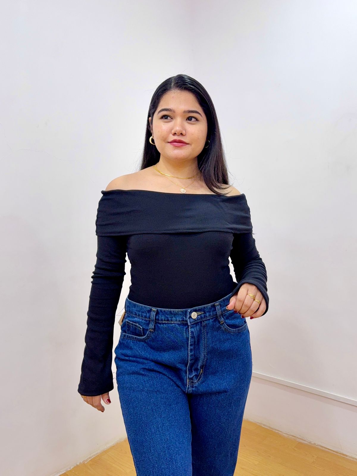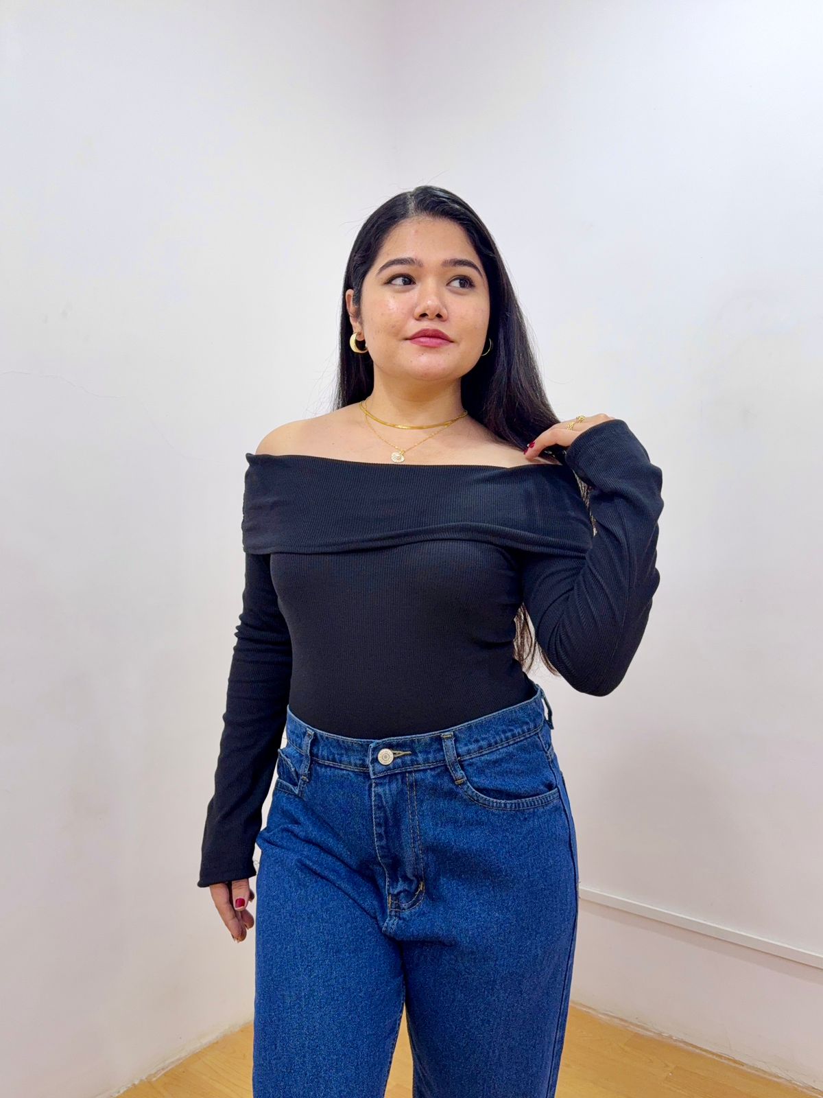 Off-shoulder Foldover Ribbed Knit Flare Sleeves Top