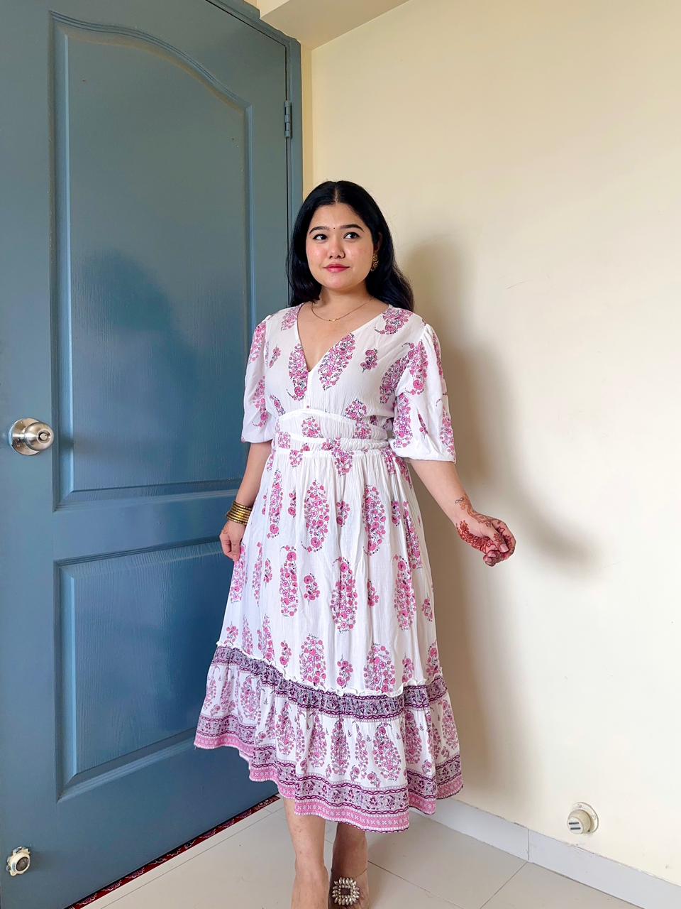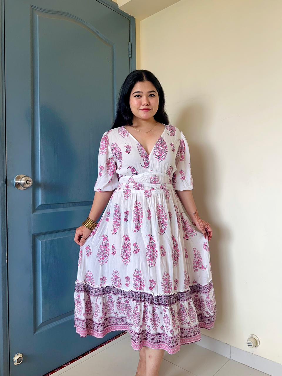 Be the first to review “Pink Floral Print V-Neck Flare Dress”